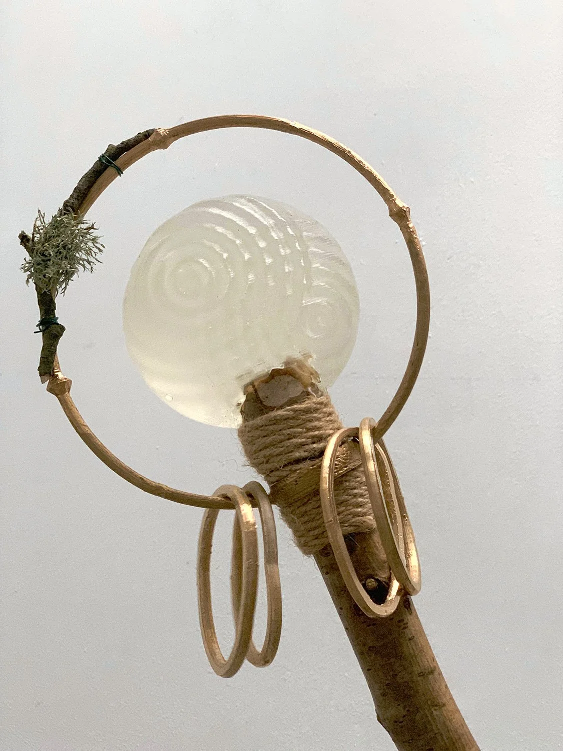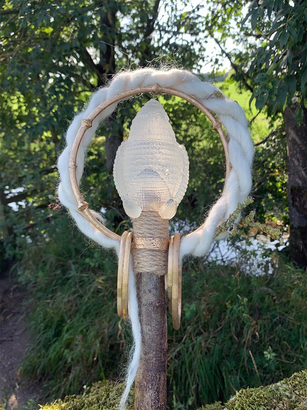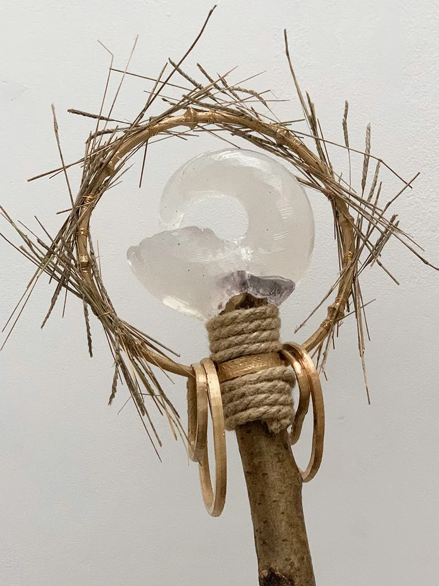 Ash Shakujo, 2023, hazel, cast bronze, wax, wool, hemp rope, foraged natural materials, 190 x 15 x 10 cm