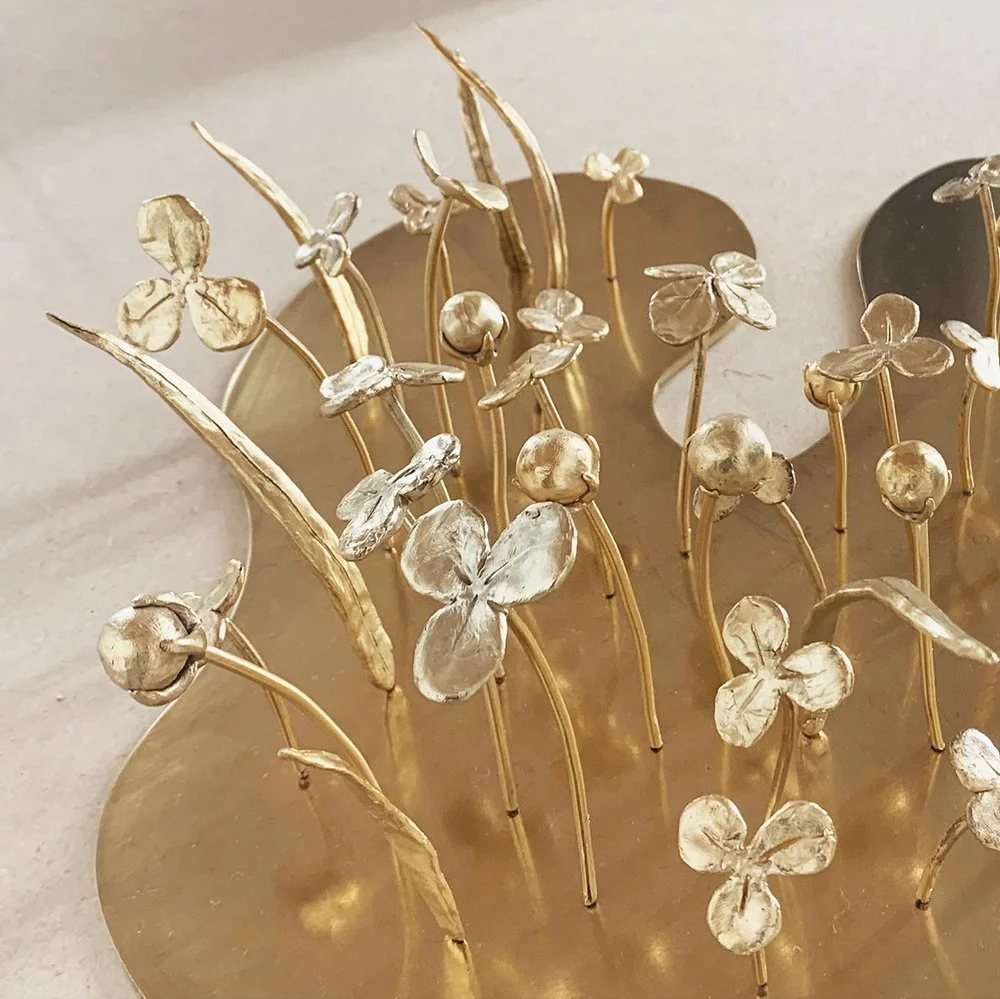 River Shakujo, 2023, hazel, cast bronze, wax, hemp rope, foraged natural materials, 190 x 15 x 10 cm