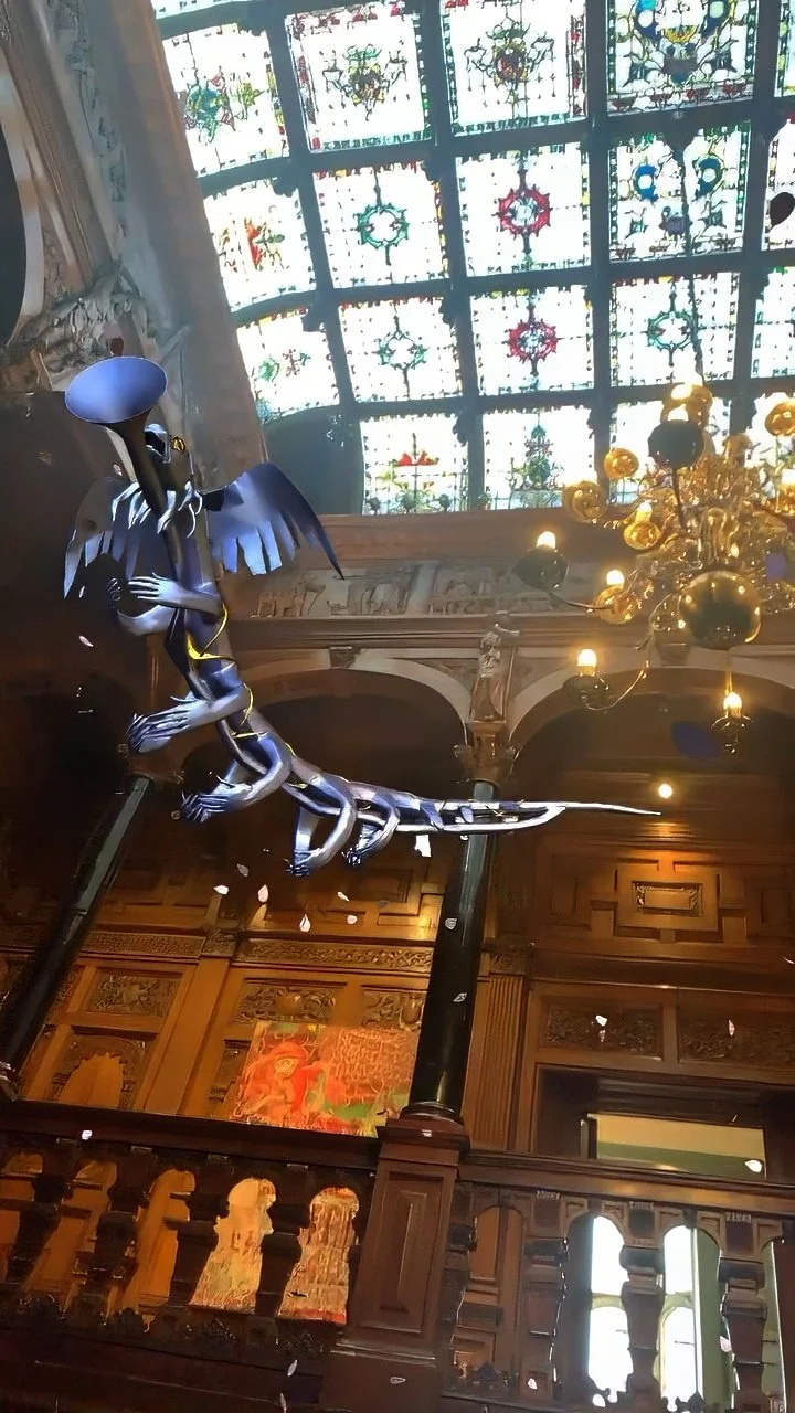 When Herald is activated, it escapes its bodily vessel like a genie, issuing forth from its own phallic trumpet-like horn. It spirals up the grand staircase, spilling rose petals from this horn onto viewers below, and circles infinitely under the stained glass ceiling, surrounded by friezes of other worlds and other lives - like Astor, it seeks to transcend its base reality and float among legends of myth and history.