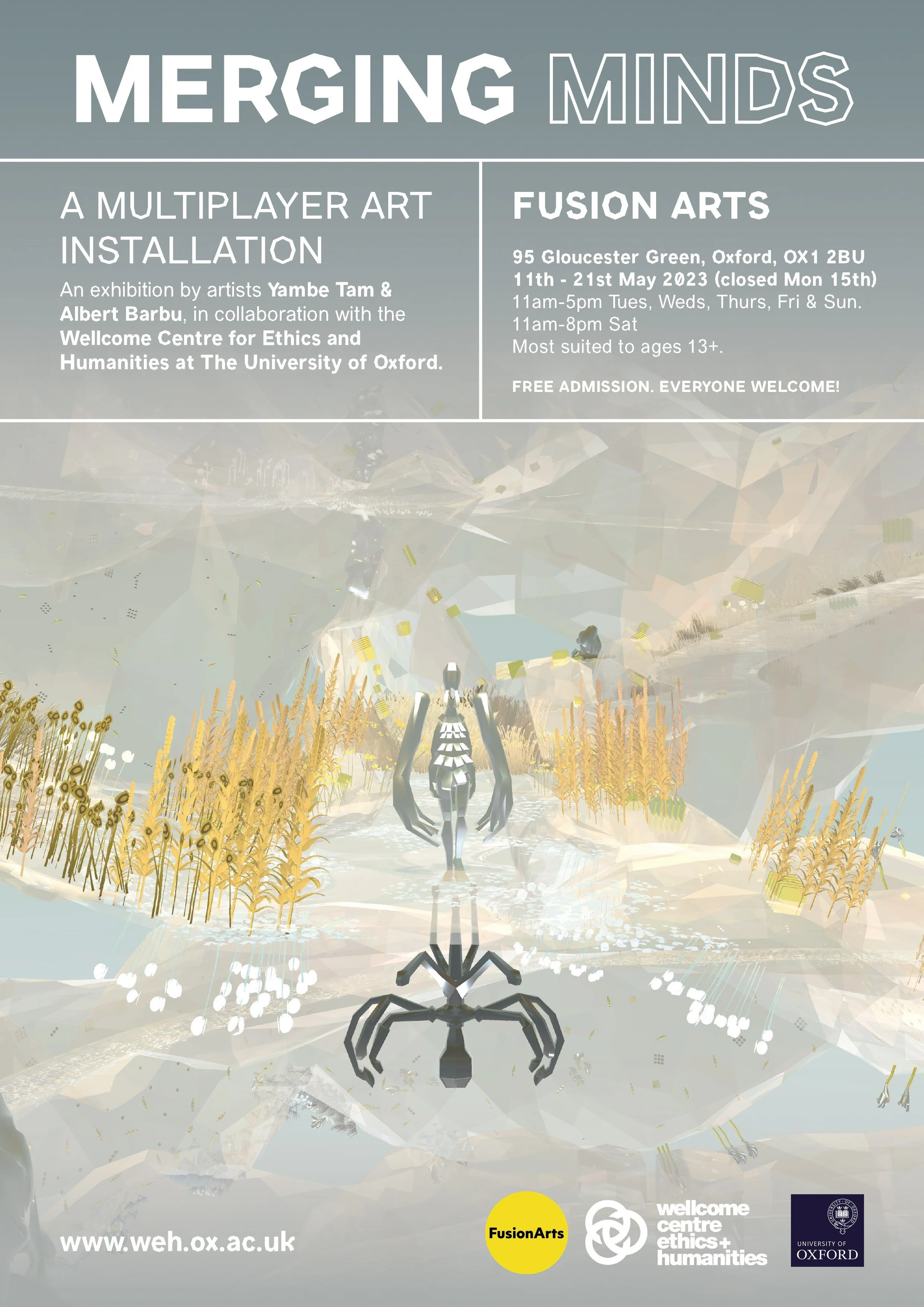 Merging Minds is a live multiplayer art installation, that has been co-created as a result of a collaboration between artist/creative technologist duo Yambe Tam & Albert Barbu and the ‘Rethinking Collective Minds’ research strand, part of the Wellcome Centre of Ethics and Humanities (WEH) at the University of Oxford.