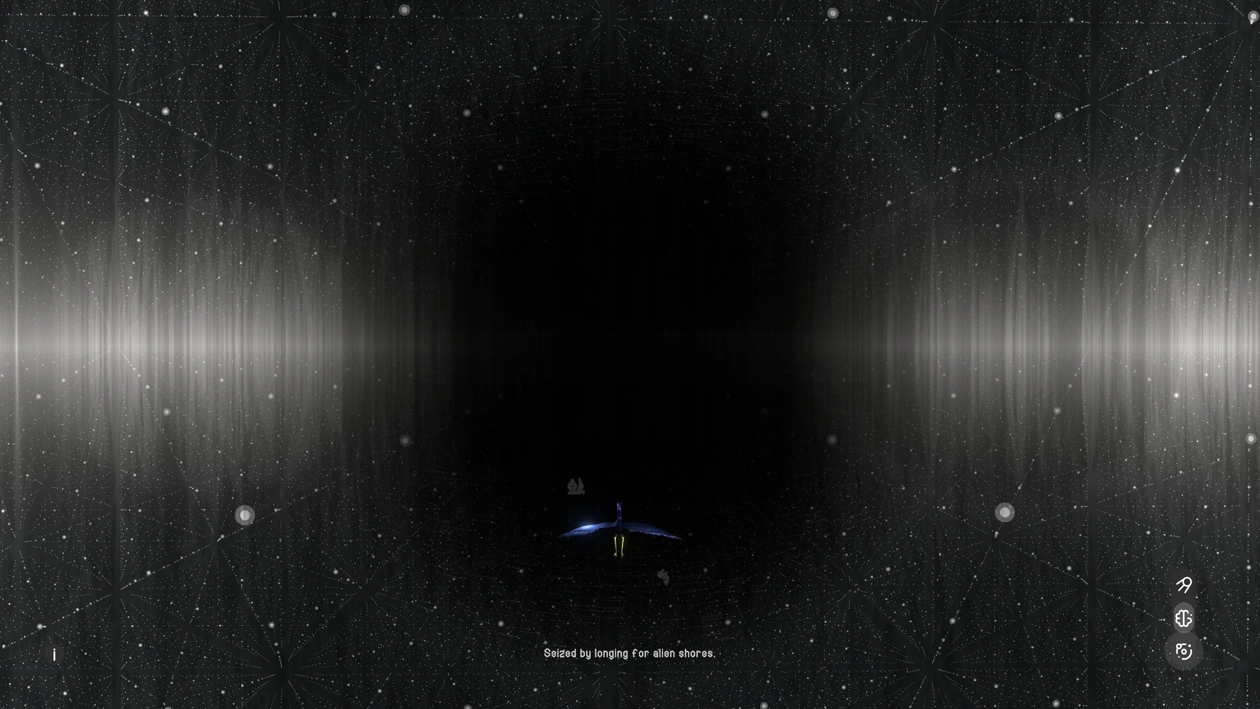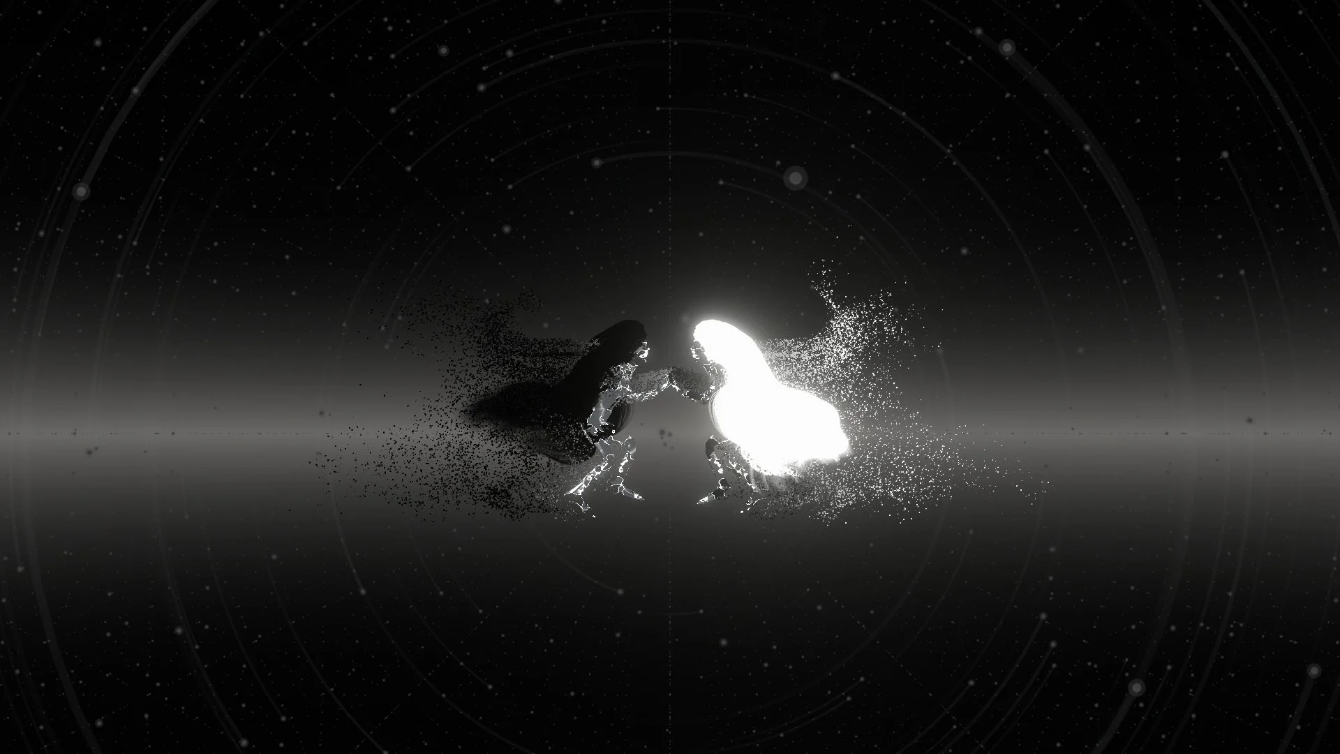 Shadow of Unknowing (SoU) is an existential cosmic simulation: a meditation on uncertainty and the unknown. It explores the limits of human perception and understanding of the universe, and our attempts through scientific and spiritual means to establish absolute truth and certainty in a vast, unknowable cosmos. Split across three views, it follows the slow, looping journey of a Traveller and an Observer through a black hole and white hole as they are destroyed and reincarnate time and time again. Locked into this cyclic cosmic dance, their experience of reality changes the more they come to understand - though through the powerful effects of the black hole on spacetime, their experience of reality is not always the same.
